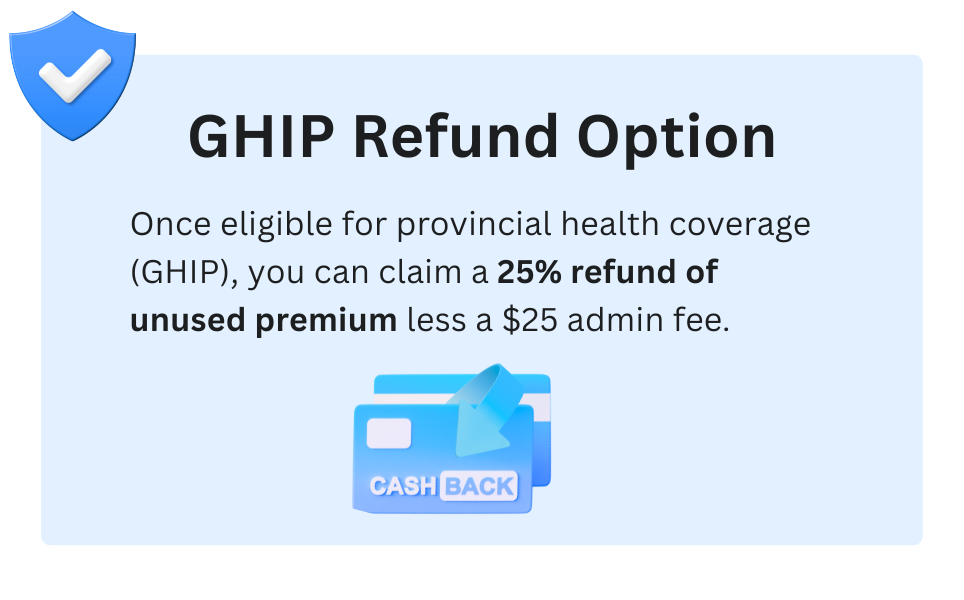 While most policies only refund you if you leave Canada, we put money back in your pocket while you stay. You can receive a 25% refund of your remaining premium (less a $25 fee) once your provincial coverage kicks in.